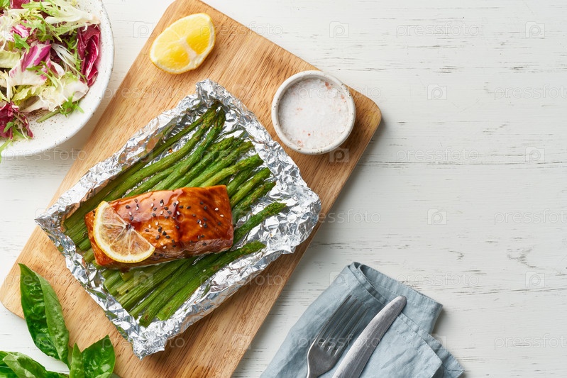 Ужин в фольге с красной рыбой. Филе лосося со спаржей. Горячий ужин, запеченный в духовке