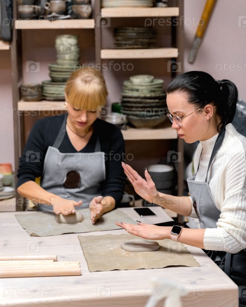 Женщина делает керамическую посуду в мастерской. Концепция для женщины-фрилансера, бизнеса. Продукт ручной работы. Подрабатывайте, подрабатывайте, превращая хобби в работу. Селективный фокус, малая глубина