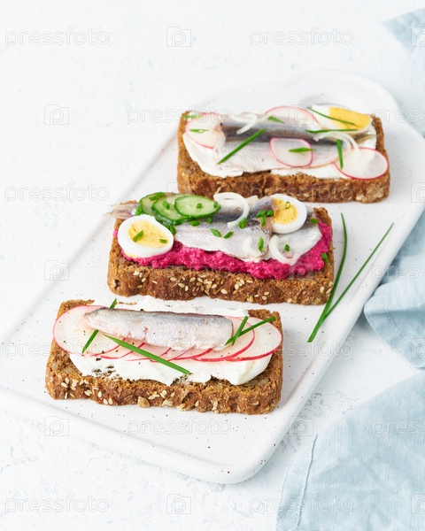 Пикантный смореброд, набор традиционных датских сэндвичей. Черный ржаной хлеб