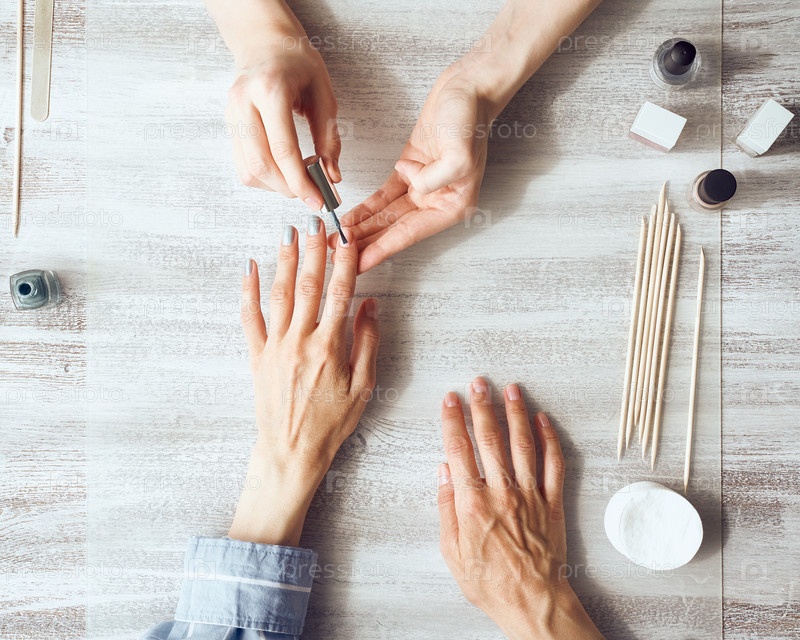 Мать и дочь делают маникюр, красят ногти лаком. Уход на дому во время карантина, самоизоляции. Вид сверху на руки на столе