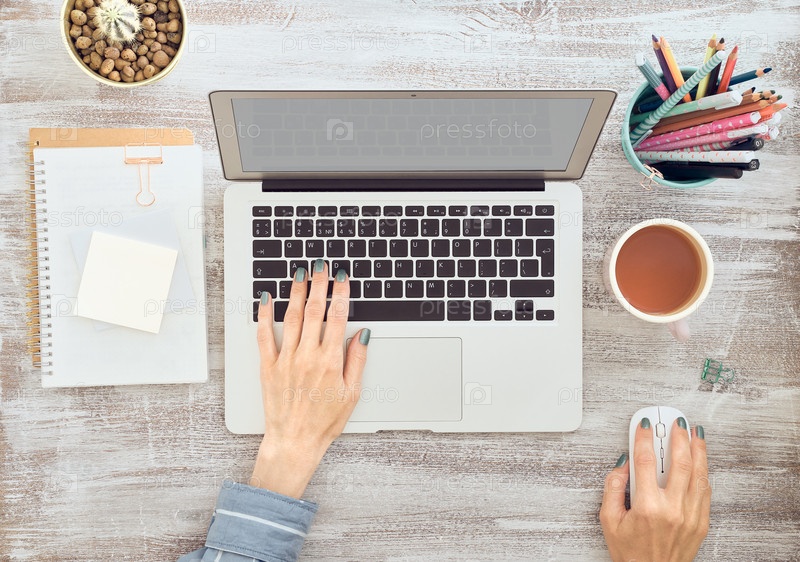 Работа на дому, покупки в Интернете, обучение. Вид сверху. Дистанционное обучение. Руки женщины печатают на ноутбуке. Фрилансер, концепция цифрового кочевника