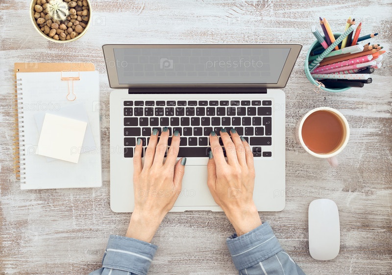 Работа на дому, покупки в Интернете, обучение. Вид сверху. Дистанционное обучение