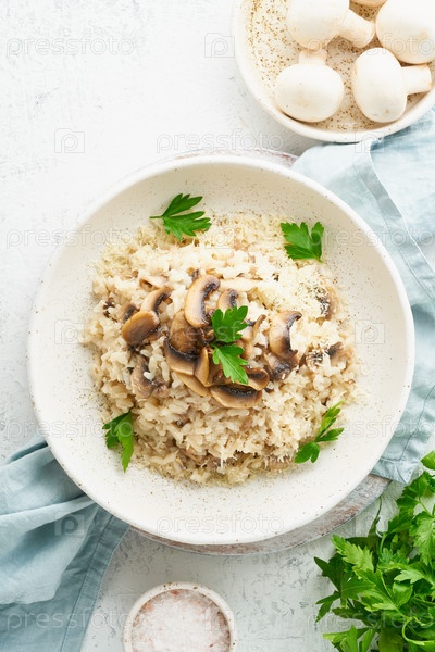 Ризотто с грибами в тарелке. Рисовая каша с грибами и петрушкой. Белый стол, ложки, грибы. Горячее блюдо, итальянская кухня, вид сверху, вертикаль