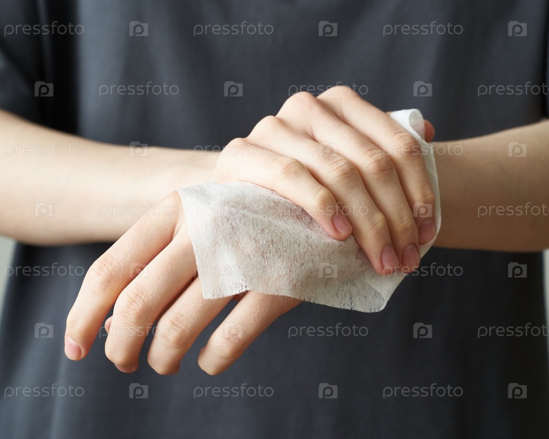 Женщина моет руки влажными салфетоками, чтобы предотвратить заражение новым коронавирусом 2019-nCoV после посещения общественного места.Концепция антисептиков, гигиены и здравоохранения