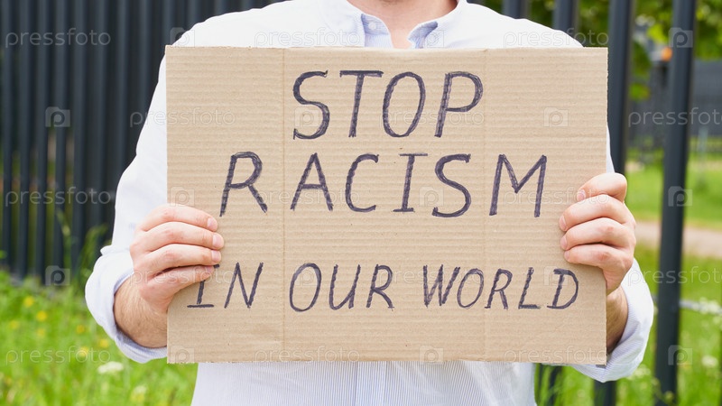 Остановить концепцию расизма. Неузнаваемый белый человек держит табличку с текстом против расизма