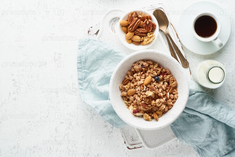 Сухая гранола в миске. Завтрак, здоровая диетическая еда с молоком в бутылке, овсяными хлопьями, орехами, бананом, белым столом. Вид сверху, пространство для копирования