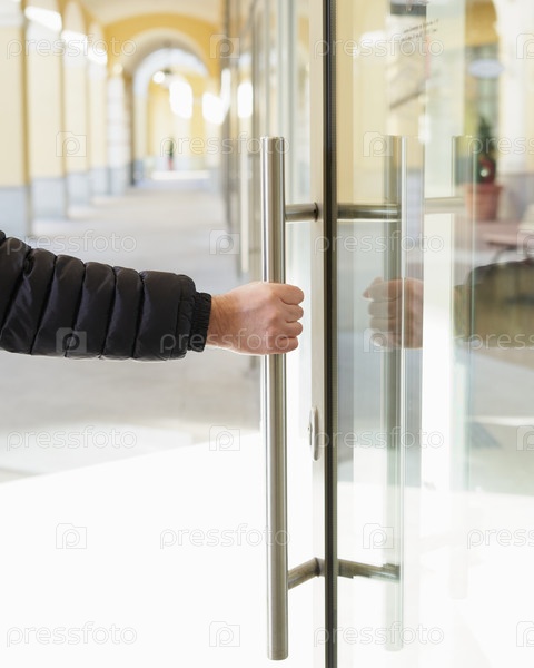 Мужчина берет дверную ручку в руку и открывает дверь. Место скопления коронавируса, COVID-19, микробов, бактерий, вирусов. Прикосновение к заложникам самый быстрый способ заражения