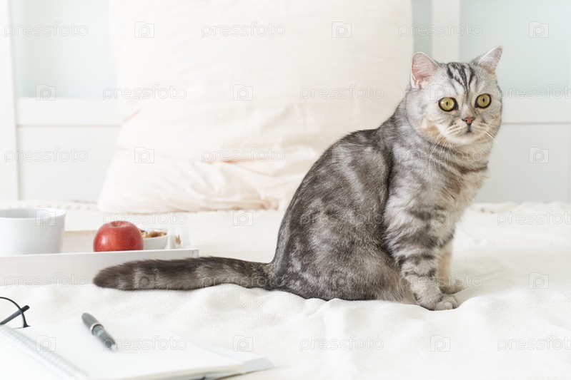 Шотландский полосатый кот лежит дома в постели. Карантин, самоизоляция, социофобия. Уютная концепция выходного дня