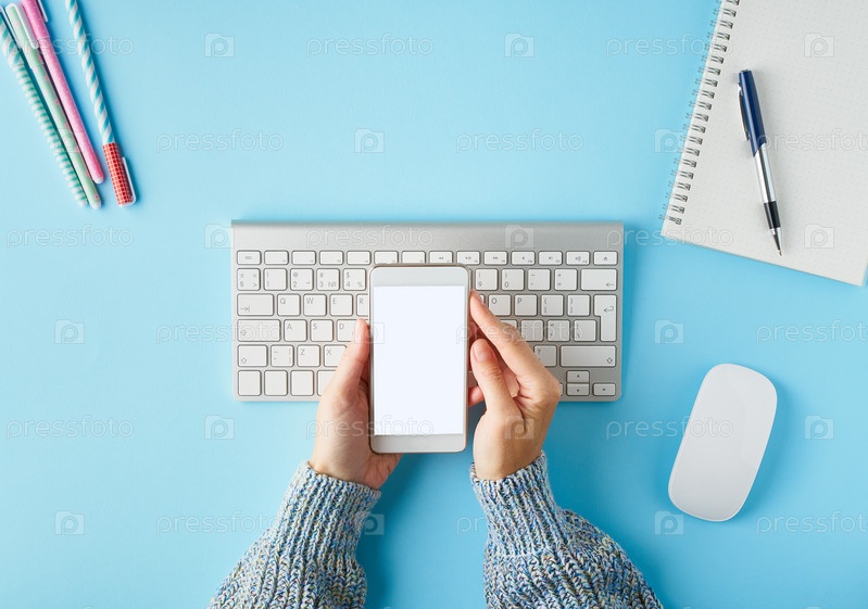 Мобильный телефон с пустым белым экраном в руке. Ярко-синий современный письменный стол