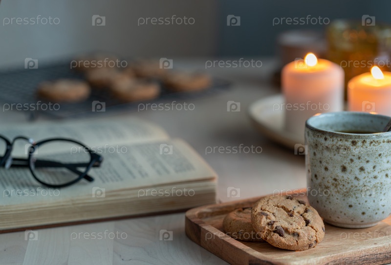 Чтение книги уютным зимним вечером со свечами, чаем и печеньем. Вид сбоку