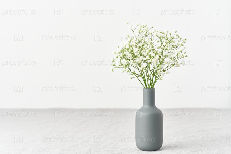 Цветы гипсофилы в вазе. Мягкий свет, скандинавский минимализм, белые стены, серый стол. Пустое место для текста. Весенний натюрморт, пространство для копирования