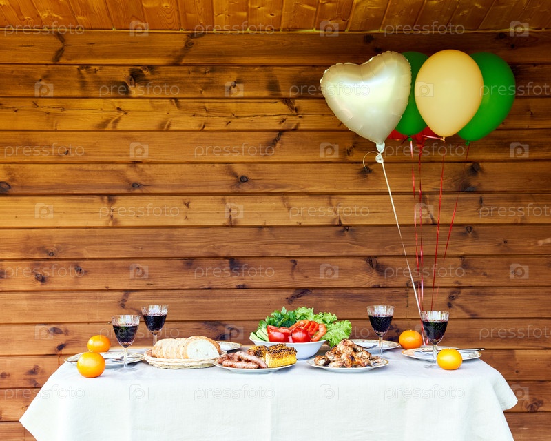 Стол, полный овощей и мясных воздушных шаров на деревянном фоне