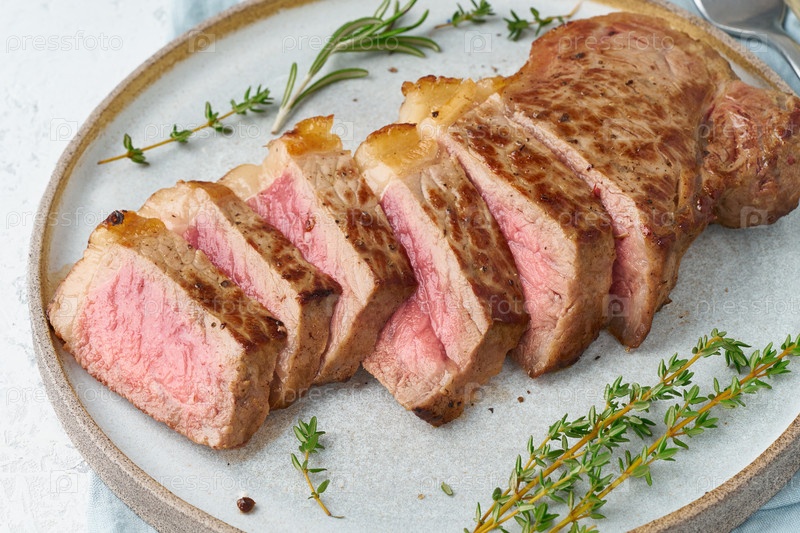 Кето-кетогенная диета, стейк из говядины, стриплойн на серой тарелке на белом фоне