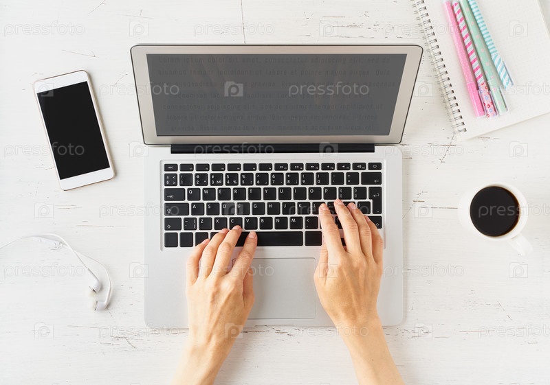 Работа на дому, покупки в Интернете, обучение. Белый письменный стол, старый стол. Вид сверху. Дистанционное обучение. Руки женщины печатают на ноутбуке. Фрилансер, концепция цифрового кочевника