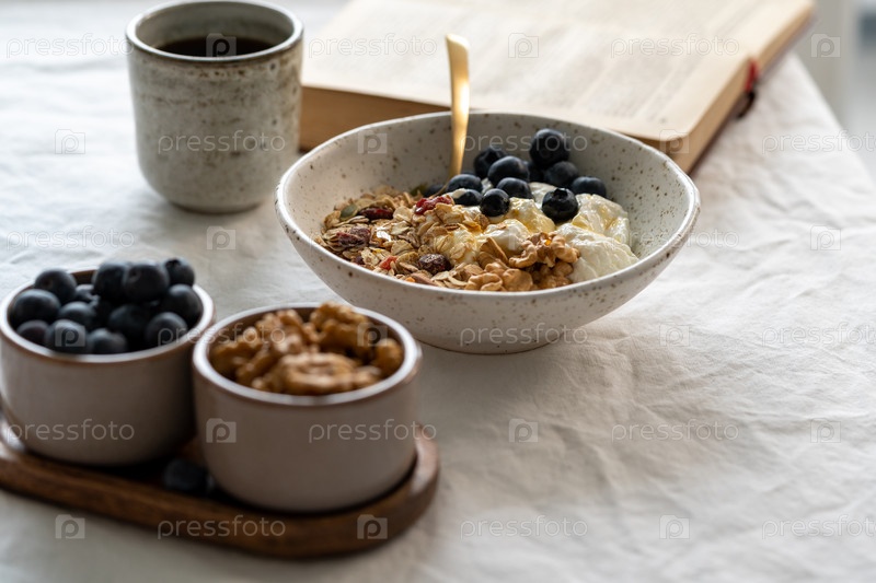 Чтение книги и завтрак здорового образа жизни с мюсли мюсли и йогуртом