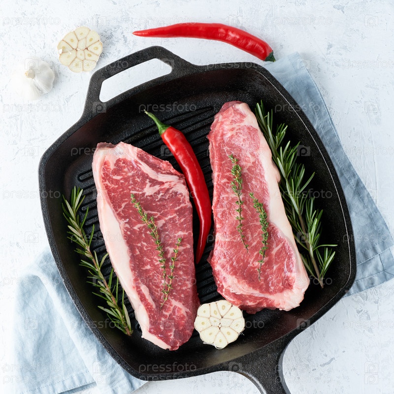 Два свежих сырых больших цельных куска мяса, говяжье филе, мраморный стриплойн в большой чугунной сковороде
