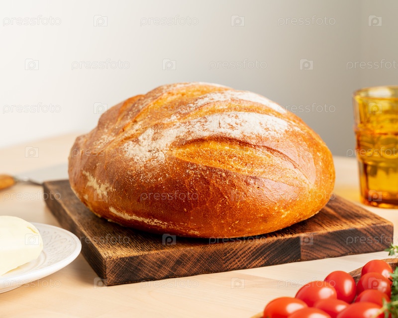 Целая буханка свежеиспеченного белого пшеничного хлеба на деревянной доске на домашнем кухонном столе, вид сбоку