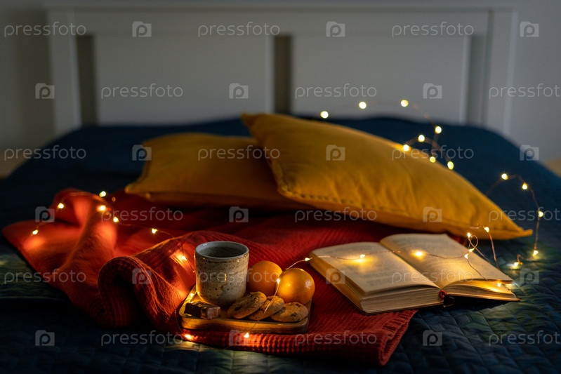 Уютный фон для чтения книг, расслабления и размышлений. Оставайтесь дома. Рождественское украшение с гирляндами, подушками и горячим напитком с печеньем на кровати. Темные вечерние сумерки в спальне