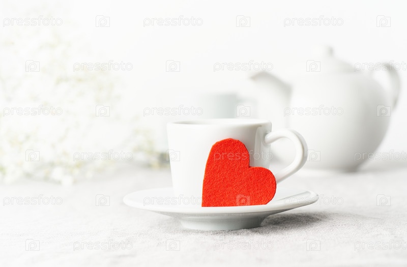 День святого Валентина. Утренний завтрак на двоих с чаем и цветами. Красное фетровое сердце – символ влюбленных. Светло-белый нежный пастельный фон. Скандинавский минимализм. Вид сбоку, пространство для копирования