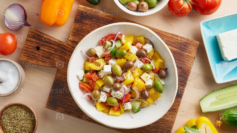 Баннер Греческий деревенский салат хориатики с сыром фета, оливками, перцем, помидорами, огурцом и красным луком, вегетарианская средиземноморская еда, низкокалорийная диетическая еда, пространство для копирования