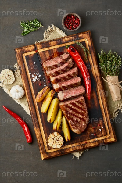 Кето-кетогенная диета жареный на гриле говяжий стейк, стриплойн, нарезанный картофель на разделочной доске на темно-коричневом столе. Рецепт палео еды с нарезанным куском мяса, вид сверху, вертикальный