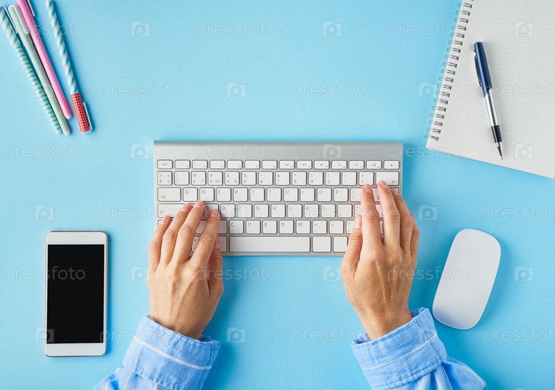 Ярко-синий современный письменный стол. Вид сверху. Дистанционное обучение. Скопируйте пространство, макет. Фрилансер, концепция цифрового кочевника. Клавиатура и мобильный телефон на столе
