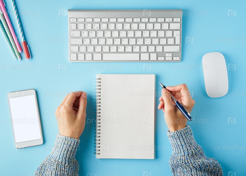 Безликая женщина пишет в блокноте. Мобильный телефон с пустым белым экраном