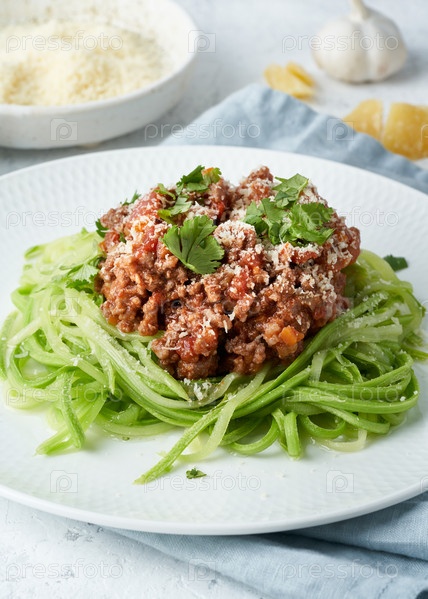 Кето-паста Болоньезе с мясным фаршем и лапшой из цуккини, фодмап, lchf, низкоуглеводная кетогенная диета. Вид со стороны, крупный план. Чистое питание, сбалансированное питание