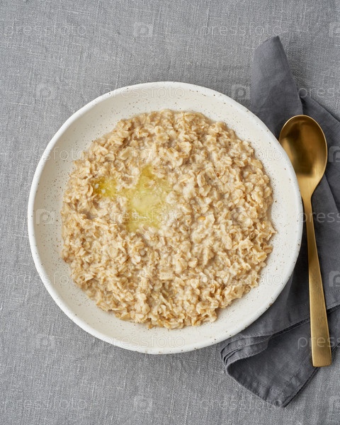 Цельная овсянка, большая тарелка каши с маслом на завтрак, утренний прием пищи. Вид сверху