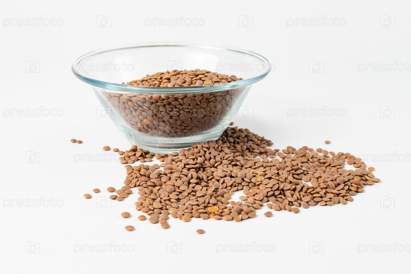 Чечевица находится в стеклянной миске и разбросана бок о бок на белом фоне