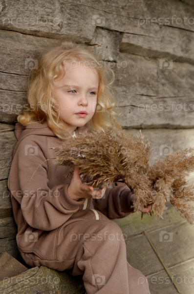 Девочка в коричневом костюме с тростником в руках сидит у деревянной стены