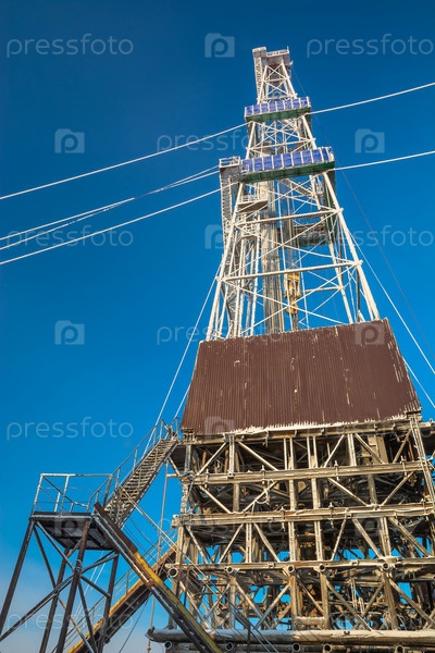 Бурение скважины зимой на северном нефтегазовом месторождении. Буровая установка покрыта снегом. Вид снаружи. Полярный морозный день. Голубое небо