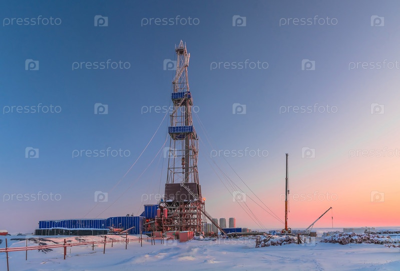 В зимней заснеженной тундре бурят скважину на месторождении нефти и газа. Полярный день. Красивое небо. Буровая установка покрыта снегом