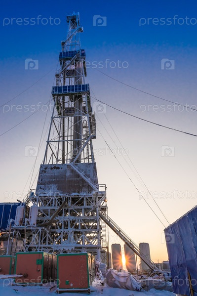 Зимний полярный день в Арктике. Бурение скважины на северном нефтегазовом месторождении. Низкое солнце. Красивое освещение