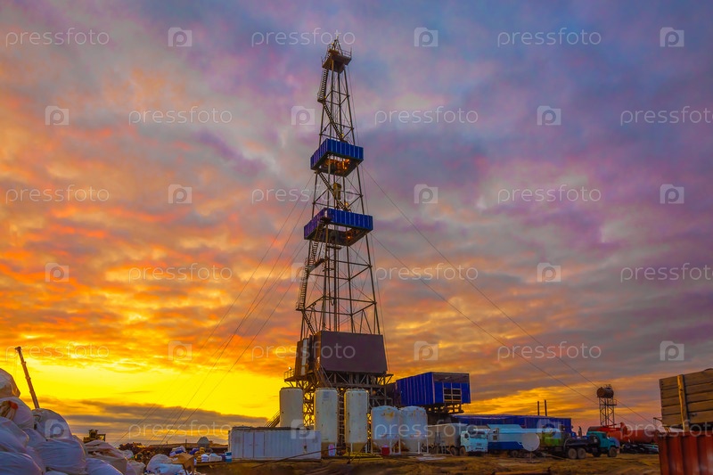 Буровая установка с башней-башней. Внизу находится буровое оборудование. На северном месторождении для добычи нефти и газа бурят глубокую скважину. Летняя полярная ночь. Красивое небо с облаками с подсветкой