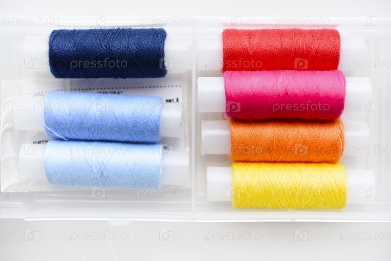 В наборе разноцветные мотки ниток. Нитки находятся в пластиковой коробочке