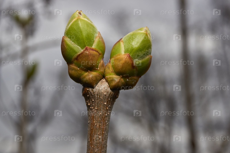 Цветочные почки сирены (лат. Syringa vulgaris) распускаются и возникают соцветия.Весна