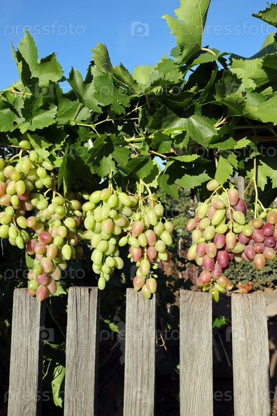 Грозди винограда висят над деревянным забором. выращивание органических продуктов
