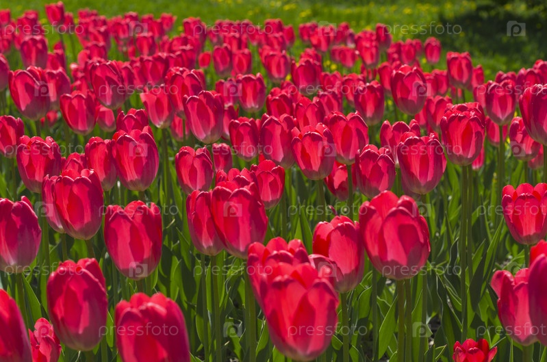 Ярко-красные тюльпаны на клумбе в парке. Солнечный день в мае
