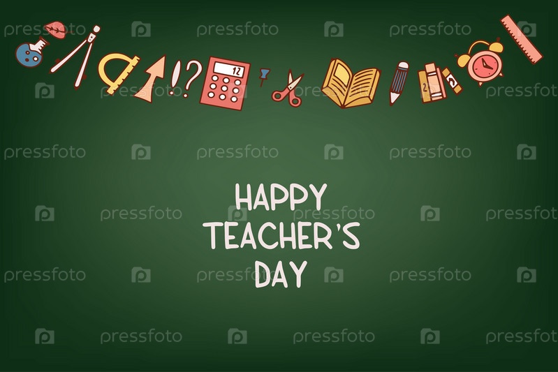 Векторная открытка с Днем учителя с надписями. Дизайн поздравительной открытки, макета, логотипа, марки или баннера ко Дню учителя. Ручные школьные принадлежности и листья