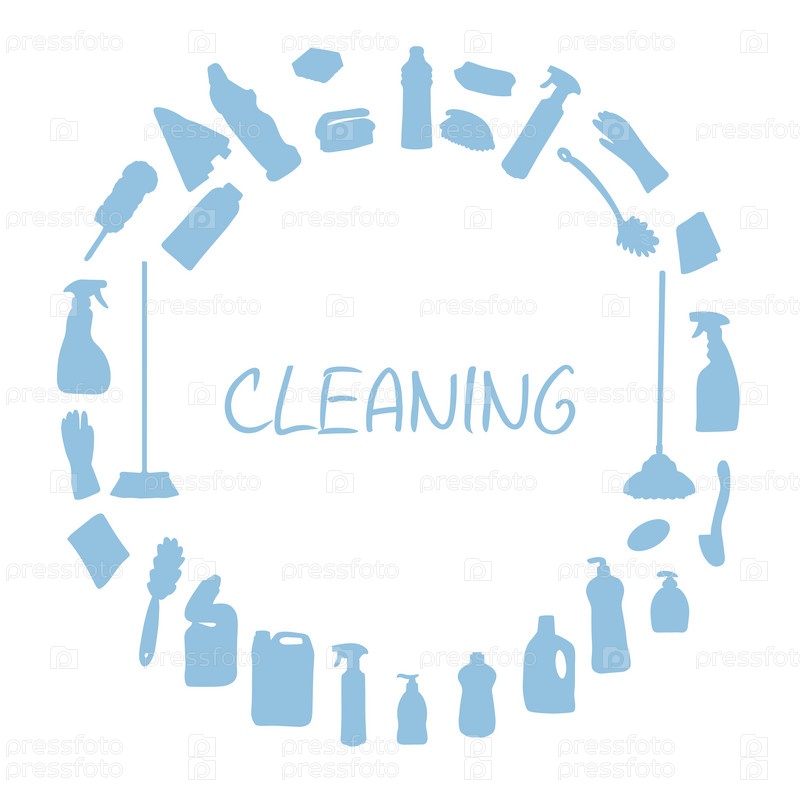Баннер из чистящего оборудования. Иконки линий очистки. Чистящие средства и инструменты для уборки и дезинфекции дома, ведра и швабры, распылители и моющие средства. Вектор