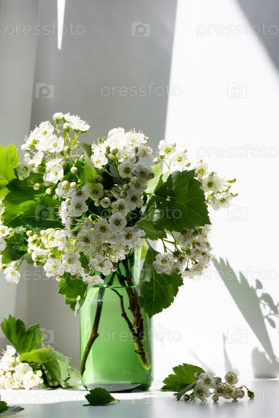 Весенний свежий букет с белой цветущей ароматной веткой черемухи с зелеными листьями в стеклянной вазе в качестве элегантного декора в мягком свете, современный простой интерьер с мраморной плиткой на деревянном столе, пространство для копирования