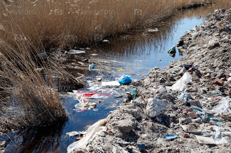 Куча мусора возле воды - загрязнение, наносящее вред природному ландшафту