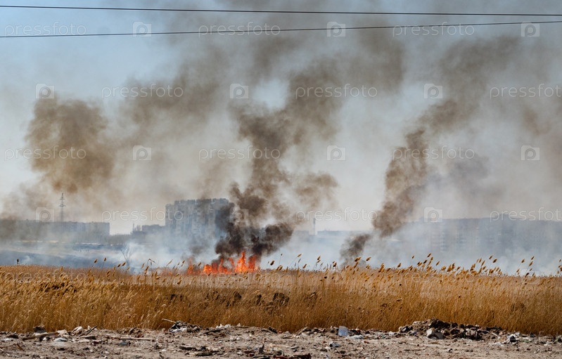Весной бушуют лесные пожары. Горящая сухая трава, камыш вдоль озера. На лугу горит трава. Экологическая катастрофа. Огонь и дым уничтожают все живое. Пожарные тушат большой пожар. Много дыма