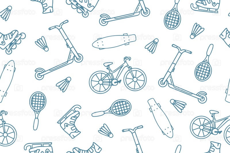 Бесшовный рисунок со спортивным инвентарем. Красочный спортивный инвентарь ручной работы. Узор на тему спорта, здорового образа жизни. Фон для использования в дизайне, упаковке, веб-сайте, ткани. Вектор