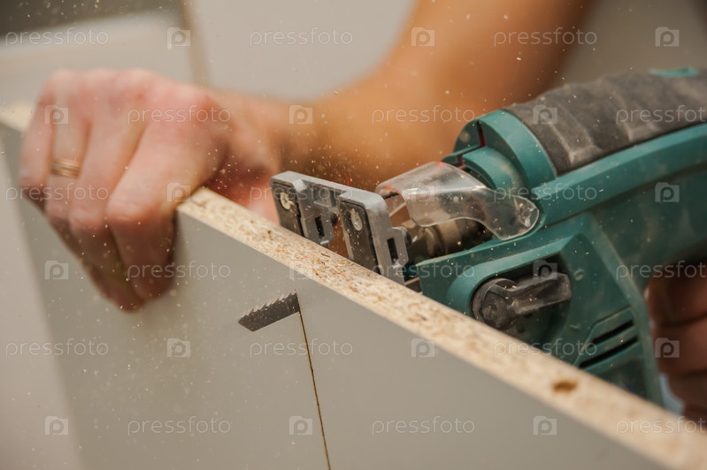 Процесс распиловки плит ДСП лобзиком при сборке мебели