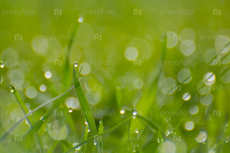 Утренняя роса на весенней зеленой траве, капельках воды