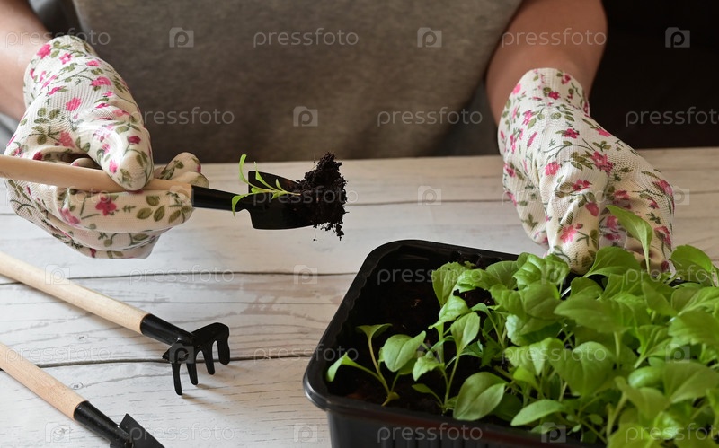 Женщина в садовых перчатках пересаживает цветок в горшок за деревянным столом, крупным планом