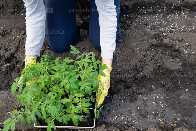 Фермер сажает рассаду помидоров в органическом саду. Высадка молодого растения в грядку