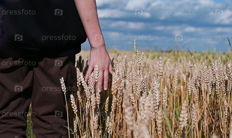 Колоски пшеницы или ржи в руках фермера. Руки пожилой женщины держат золотые колосья пшеничных колосков. Селективный фокус на колосках